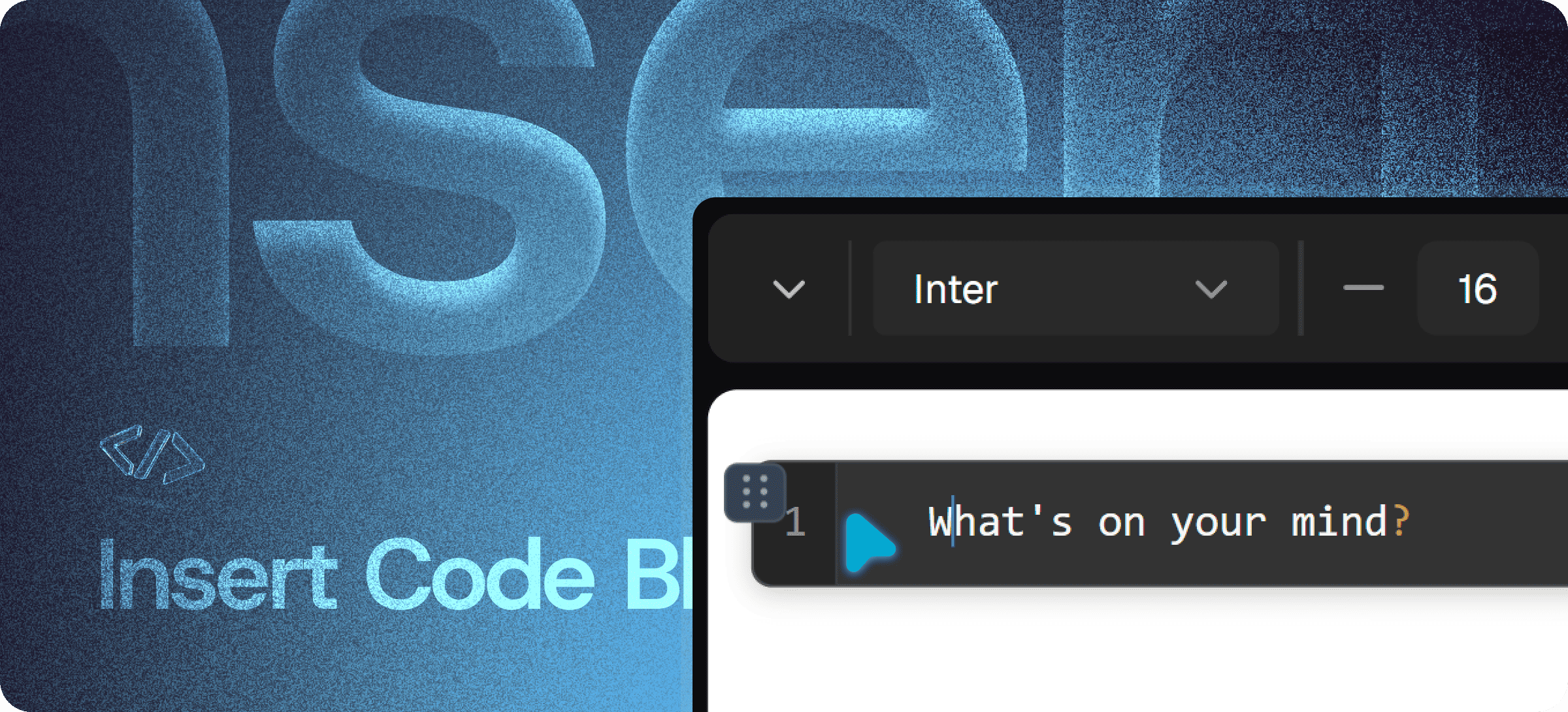 Easily add clean, formatted, and share-ready code blocks inside your content. Perfect for technical blogs, documentation, and developer-focused writing.